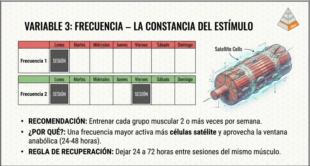 La frecuencia de entrenamiento y la sobrecarga progresiva completan los pilares de esta arquitectura hipertrófica. La recomendación actual respalda una frecuencia mínima de 2 sesiones por semana por grupo muscular, aprovechando la ventana anabólica de 24 a 72 horas y activando de manera más eficiente las células satélite responsables de la reparación y el crecimiento -1