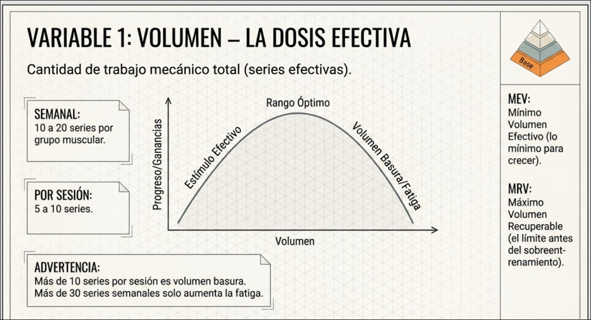 El volumen de entrenamiento constituye la dosis mecánica fundamental para desencadenar la hipertrofia muscular, entendido como la cantidad total de trabajo expresada en series efectivas por grupo muscular por semana. La evidencia científica actual respalda una relación dosis-respuesta donde el crecimiento muscular se optimiza dentro de un rango de 10 a 20 series semanales por grupo muscular, existiendo dos umbrales críticos: el Volumen Mínimo Efectivo (MEV) , que representa la dosis mínima para progresar, y el Volumen Máximo Recuperable (MRV) , que constituye el límite superior antes del sobreentrenamiento -1-2. Superar este umbral no solo deja de aportar beneficios adicionales, sino que compromete la recuperación y la síntesis proteica, desviando recursos energéticos hacia la reparación del daño muscular excesivo en lugar de hacia la construcción de nuevo tejido -1.
